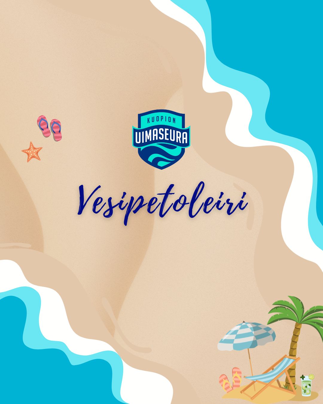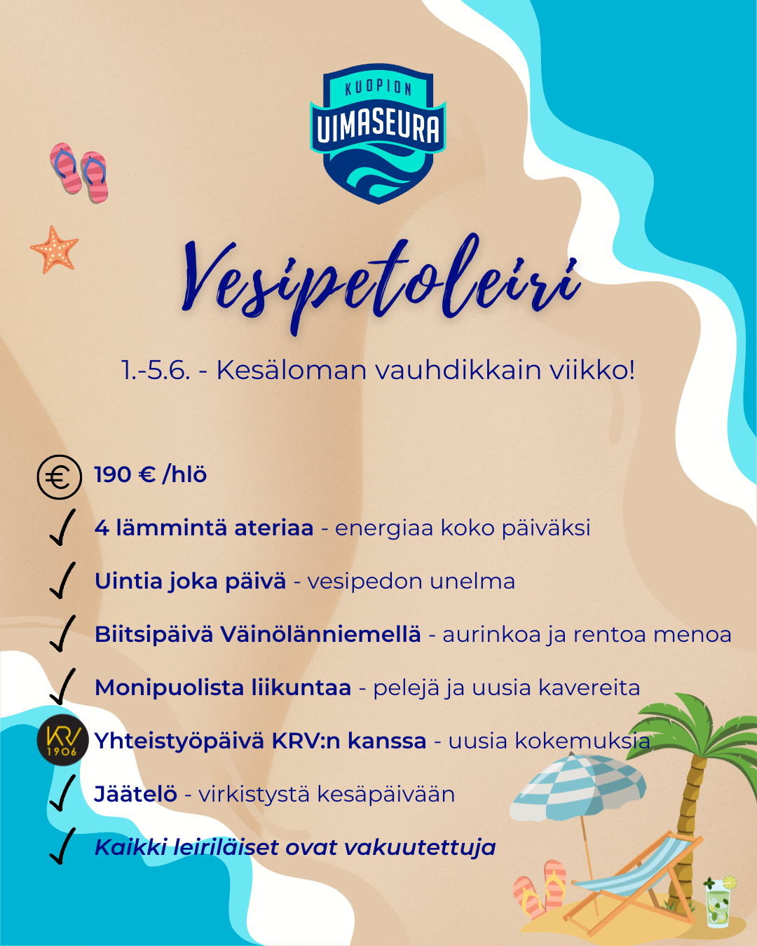 Kuopion Uimaseuran Vesipetoleiri järjestetään jälleen Kuntolaaksossa 1.–5.6.2026! Lapsen voi tuoda leirille klo 8:00-9:00 ja haku 15:15-16:00. Tarkemmat ohjeet ja aikataulut lähetetään lähempänä leiriä.