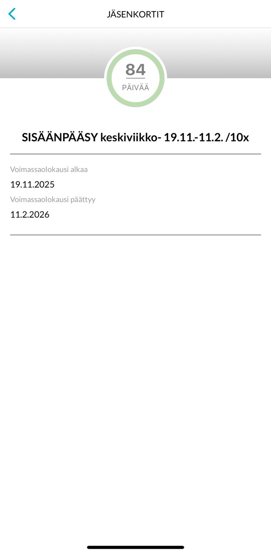 Sisäänpääsykortti on eri kuin jäsenkortti. Sisäänpääsykortissa lukee: SISÄÄNPÄÄSY + viikonpäivä - ajanjakso /kertojen määrä.
